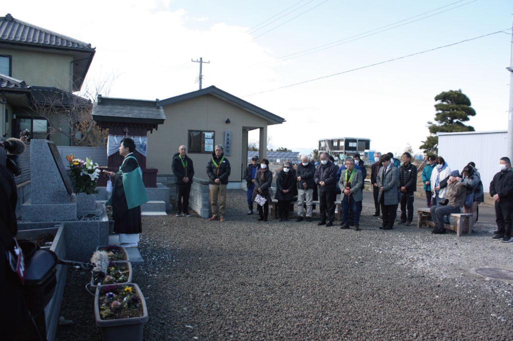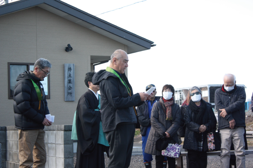 3 月11 日、井土集会所の敷地内にある慰霊碑の前で、東日本大震災で犠牲になられた方々を追悼する式典が執り行われました。海楽寺住職・大友雄一郎さんによる読経が行われる中、参加者は焼香を行い、慰霊碑に手を合わせました。